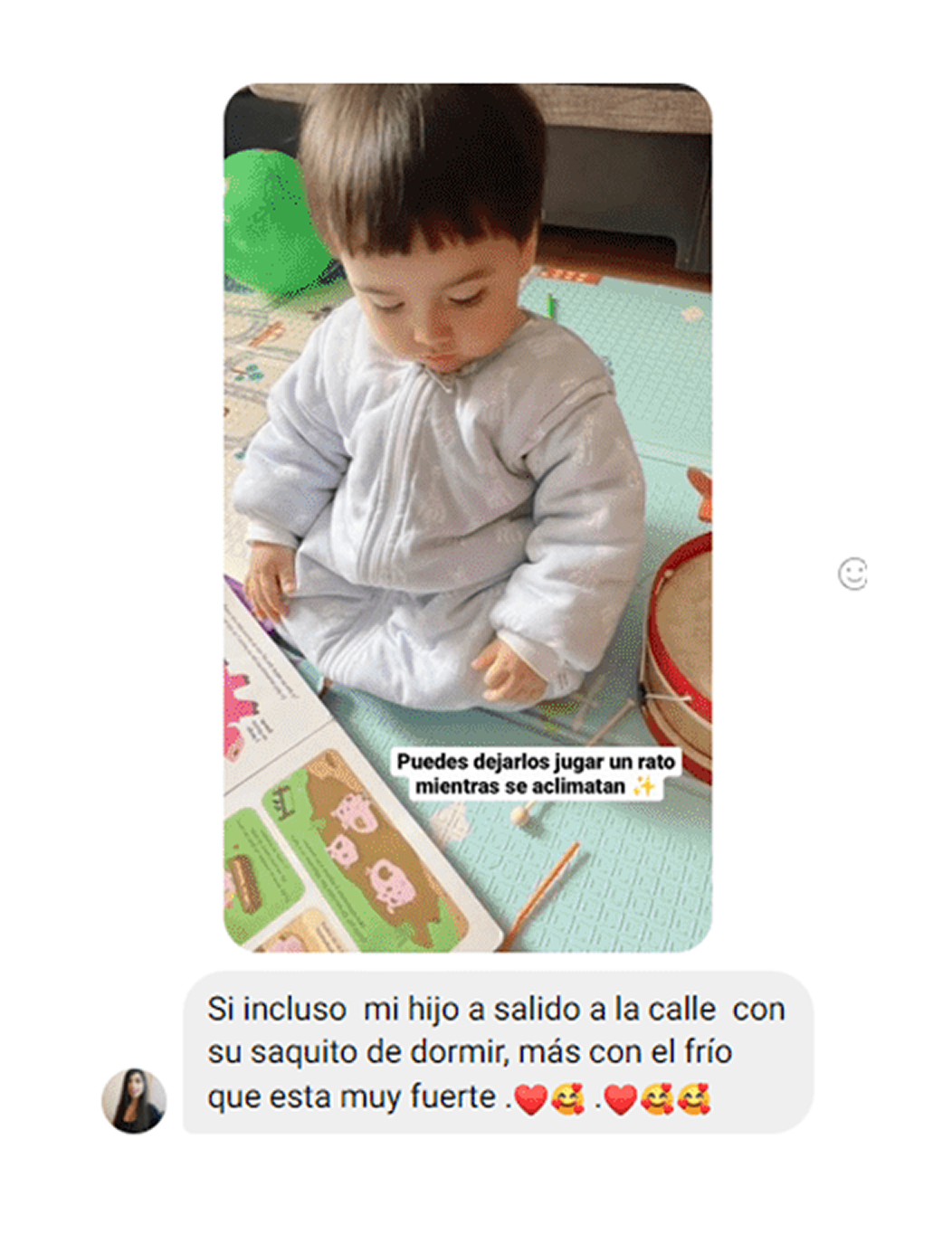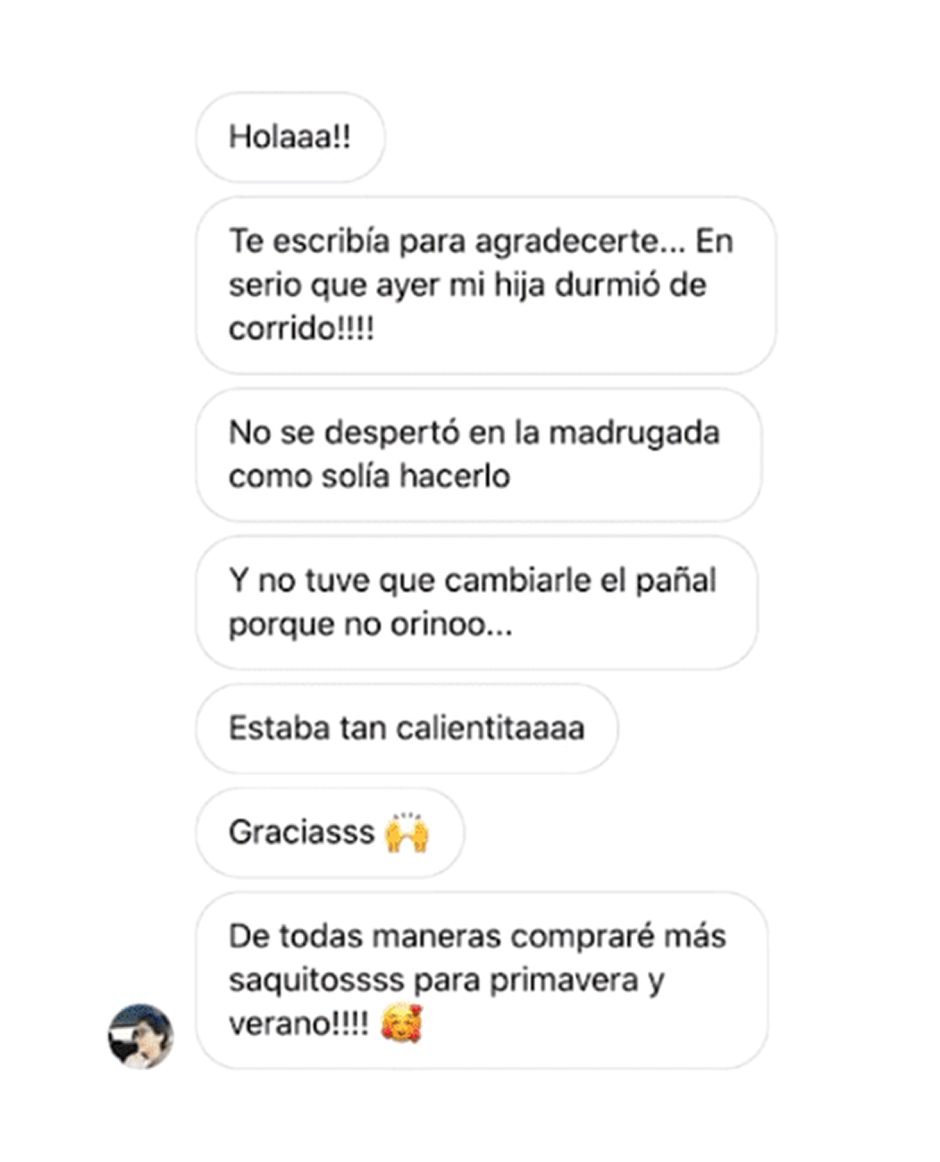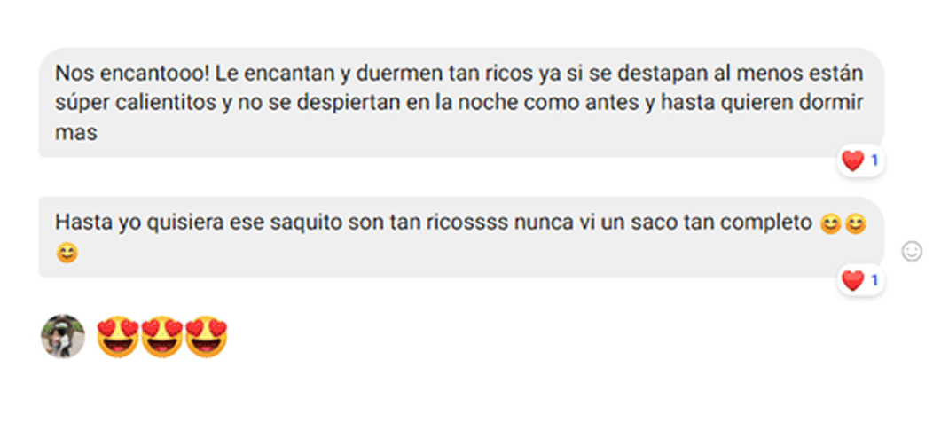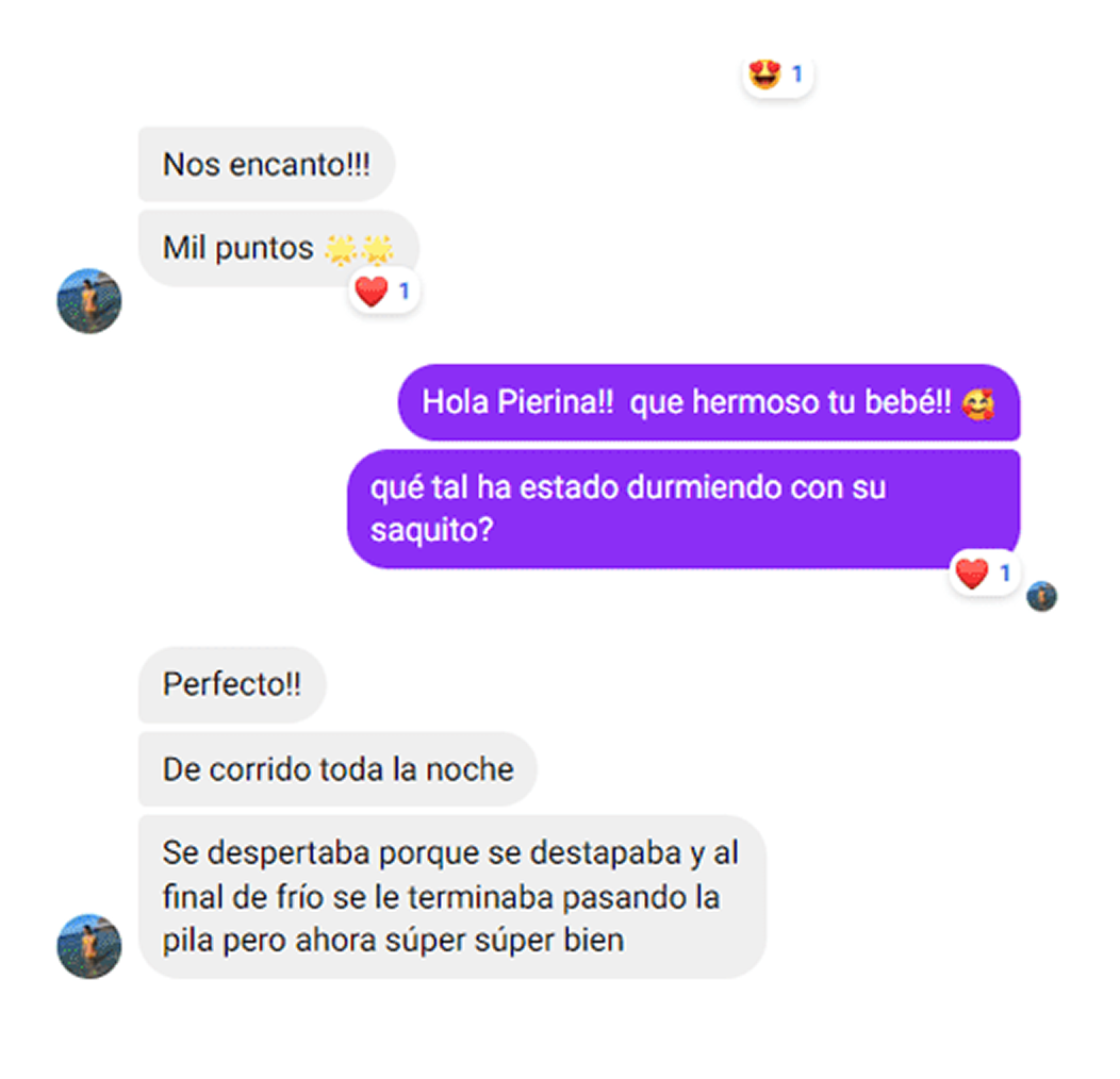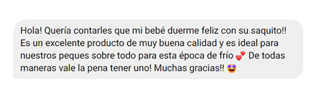 Co crea con nosotros, mándanos tus recomendaciones por mensaje en redes, comparte con nosotros tus experiencias y sus fotos, ayúdanos a testear productos, recomienda tu saquito favorito con otra mamá. Co creemos juntas y mejoremos el sueño ¡de 100 millones más de mamás!.