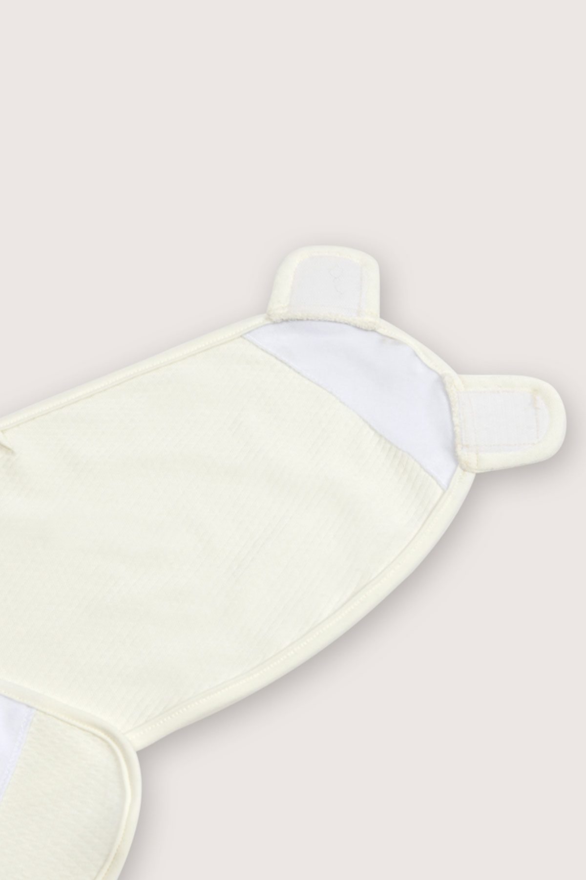 -Pon el brazo derecho de tu bebé recto hacia abajo y pasa una de las alitas de la manta swaddle por encima, lo mismo con el brazo izquierdo.